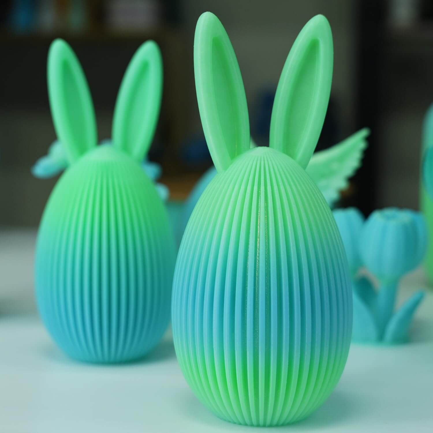 Der größte Pluspunkt dieses Farbverlauf Filaments ist zweifellos die Optik. Der mehrfarbige Verlauf wechselt, wie auf den Fotos erkennbar, sanft zwischen den blauen und grünen Farbtönen, ohne harte Übergänge oder abrupte Farbbrüche. In Kombination mit der transluzenten PETG-Struktur entsteht ein spannender Tiefeneffekt, der besonders bei organischen Formen, Vasen, Lampenschirmen oder dekorativen Gehäusen zur Geltung kommt.