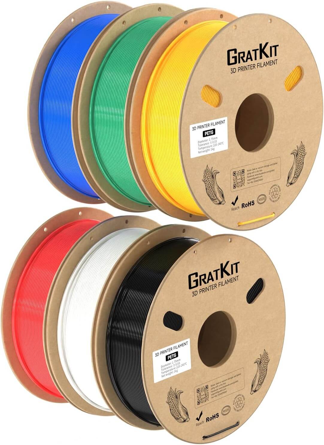 In Sachen Standardfarben deckt GratKit eigentlich alles ab, was man im Alltag benötigt. Das bedeutet blau, grün, gelb, rot, weiß und schwarz. Zudem eben mehrfärbiges PETG, Glitzer PETG und ein paar Sonderformen, die nicht immer erhältlich sind.